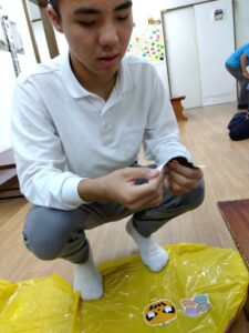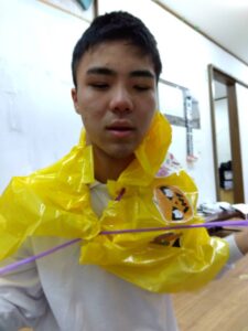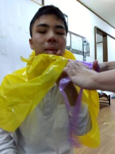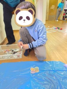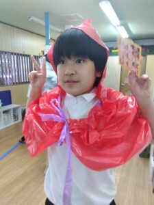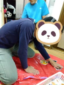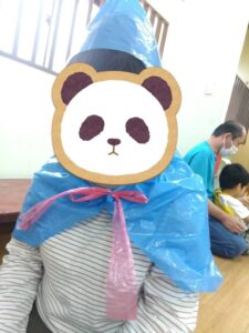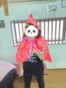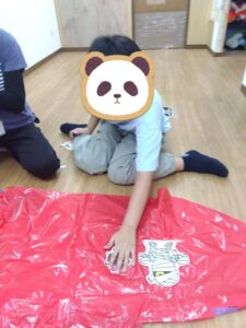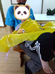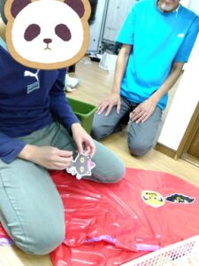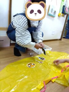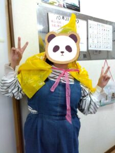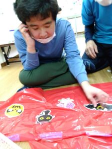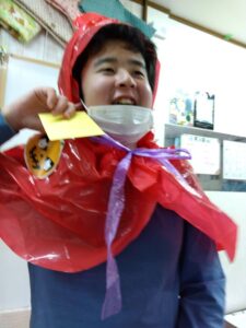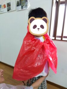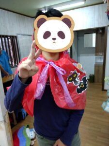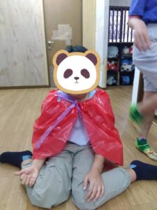 ミッションが出来た児童はお菓子を貰える式になっており、皆マント制作は少し嫌がる様子もありましたが、お菓子がある事を知ると頑張って取り組んでいました✨
